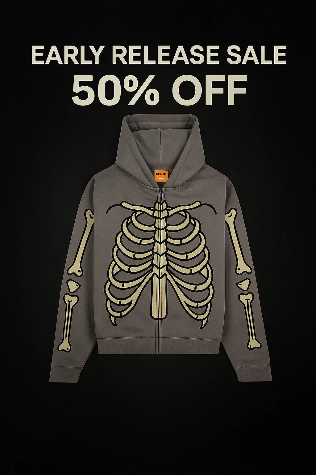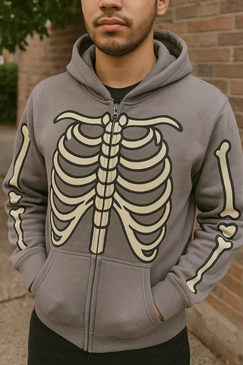 - Skeleton Zip Up Hoodie — premium midweight fleece with bold cream skeleton print across front & sleeves.